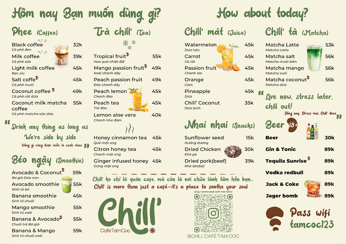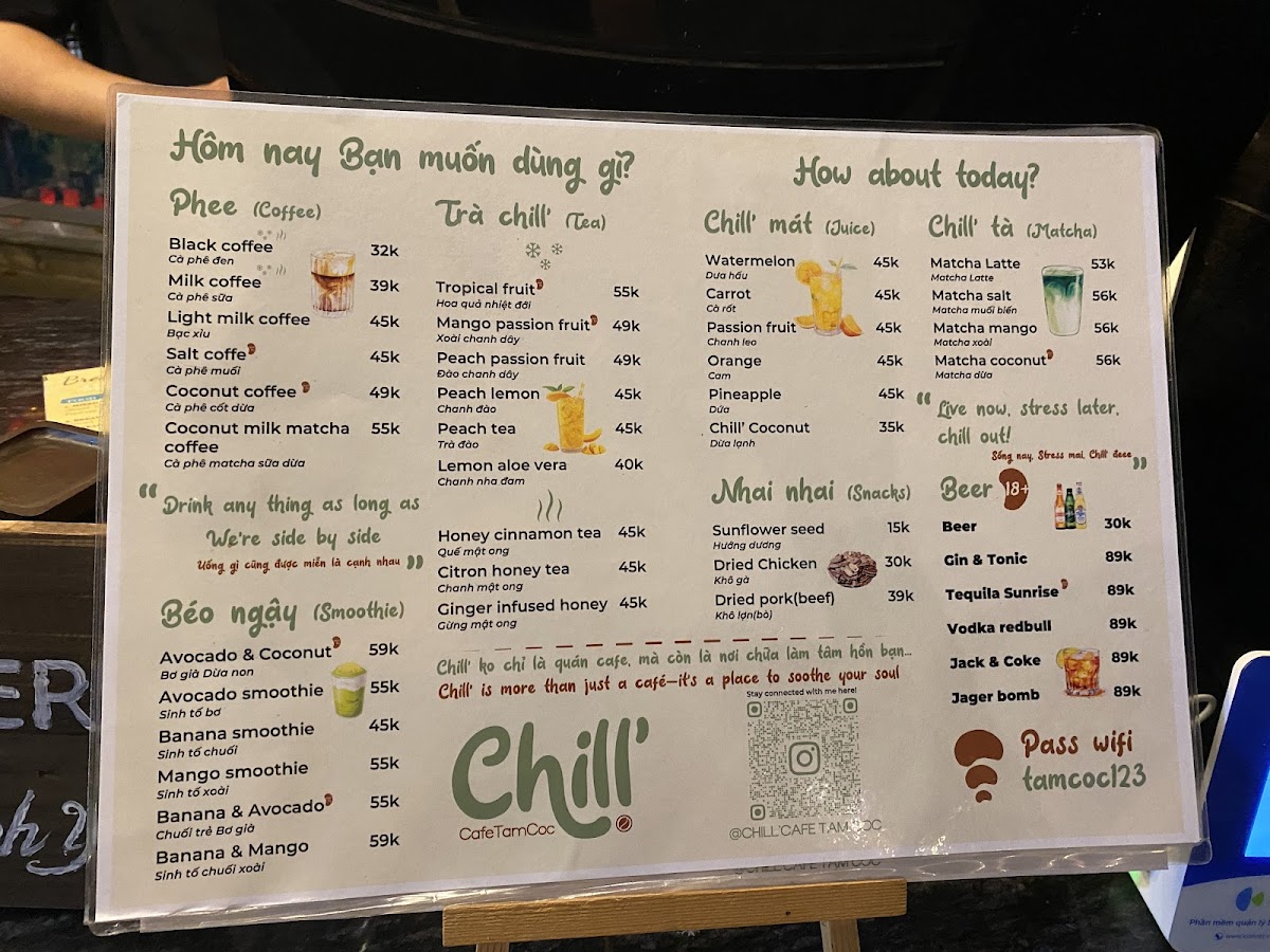 Chill' Cafe Tam Cốc isn't just a cafe; it's an experience. It's a place where the coffee is good and the vibes are even better. Whether you're there to meet friends, work remotely, or soak up the surroundings, you’ll leave feeling rejuvenated. Stop by and savor what this delightful spot has to offer; you won’t be disappointed!